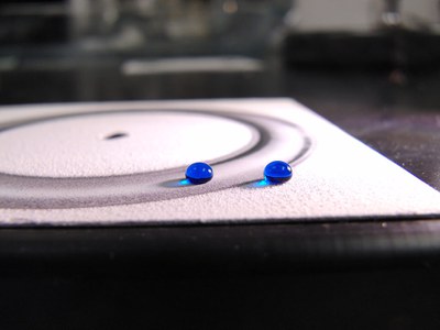 A water droplet bounces off a hydrophobic coating on a surface that has been burned and abraded.