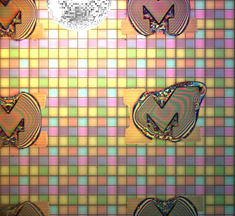AprilAn optical microscope image of a spincoated photoresist (TMPTA) on a silicon substrate after exposure to UV light with an 'M' mask and development with acetone. (Sarah Snyder, Mehta Group)