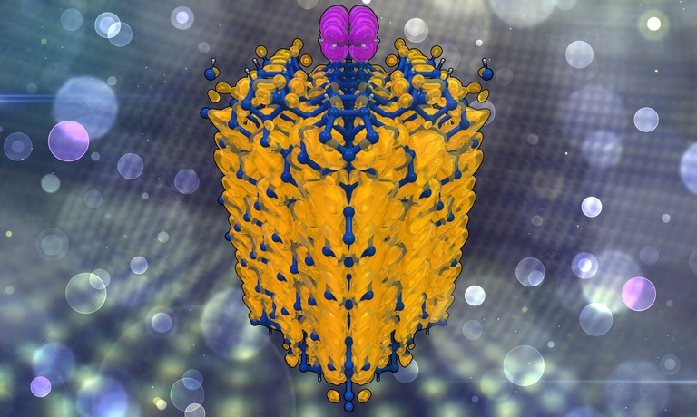 FebruaryRendering of a silicon (001) surface with a pentacene molecule resting upon it. (Michael Waters, Kieffer Group)