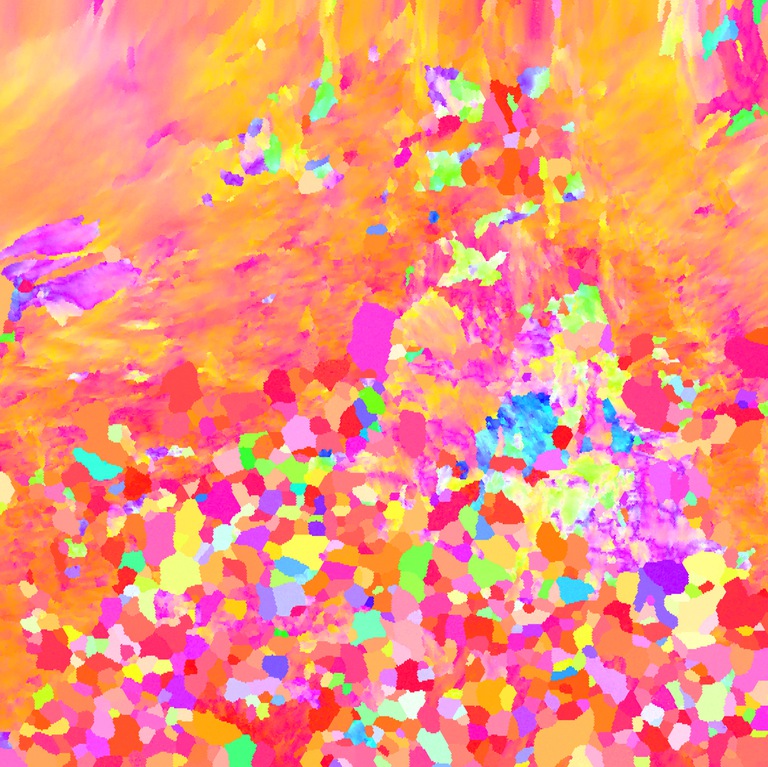 JulyElectron backscatter diffraction image from a partially recrystallized titanium aluminum alloy. (Anna Trump, Allison Group)