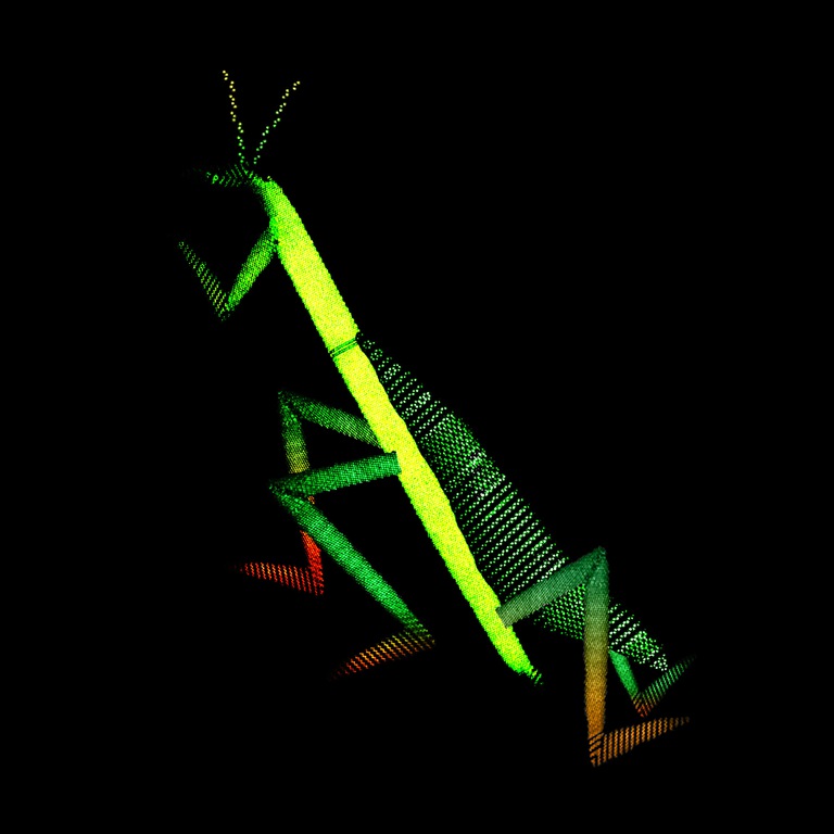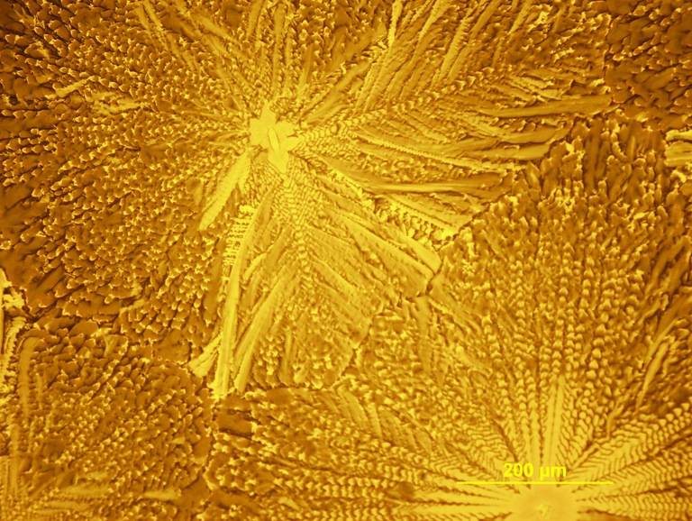MayThe "praying mantis" is made up of precipitates (B", B', B1 and B2) from a Mg-Nd alloy. You can see the structure of the different phases very clearly in most of the precipitates. (Ellen Sitzmann, Marquis Group)