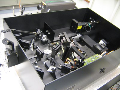 | Tandem Fabry-Perot InterferometerLocation: Gerstacker B106We measure inelastically scattered light by using a Fabry-Perot Interferometer. This setup synchronizes two interferometers for a total of six passes through the interferometer mirrors which yields a spectrum with very fine resolution. |
