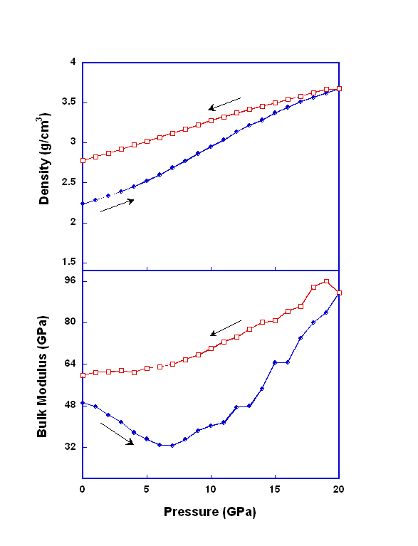 Irreversible Transformations in Simulated Silica GlassWe observed reversible and irreversible transformation in simulated silica glass under pressure. Reversible transformation explains the anomalous thermo-mechanical properties of silica glass, while irreversible transformation leads to the permanent densification in recovered silica glass. Note: arrows indicate the compression and decompression cycle.