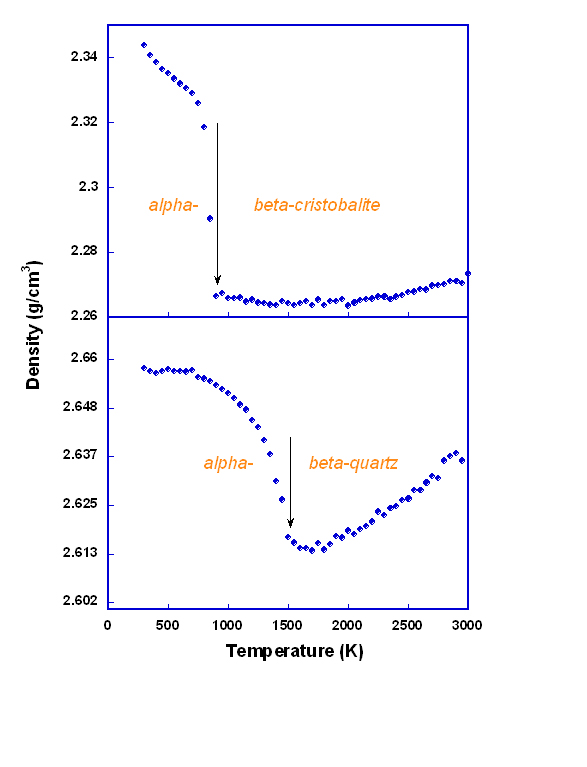 Negative Thermal Expansion in Cristobalite and Quartz SilicaUsing molecular dynamics simulations, we successfully reproduced the first-order and second-order alpha to beta transformation in cristobalite and quartz silica, respectively. Our studies reveal the structural origin of the negative thermal expansion in the high-temperature beta phases. Note: arrows indicate the transformation temperatures.