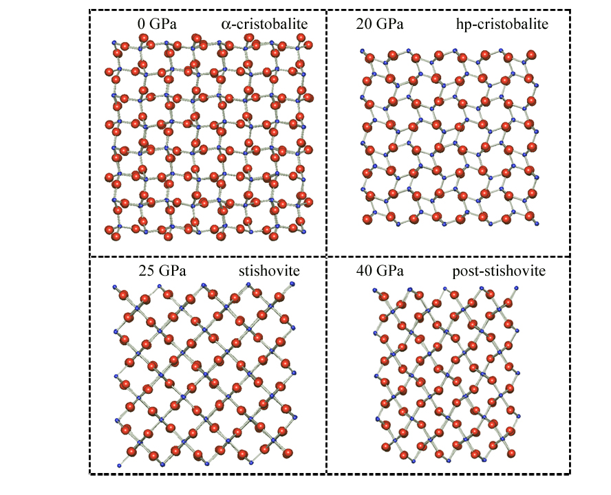 High Pressure Silica PhaseBased on concurrent molecular dynamics simulations and ab initio calculations, we uncovered a ubiquitous mechanism for the densification under pressure of minerals, such as silica, that have open structures due to their rather rigid polyhedral building blocks. Our findings finally solve the mystery with regard to the nature of the so-called X-I phase (high-pressure cristobalite silica), concluding an elusive quest that originated over a decade ago. Note: red spheres represent oxygen atoms, the blue ones are silicon atoms.