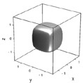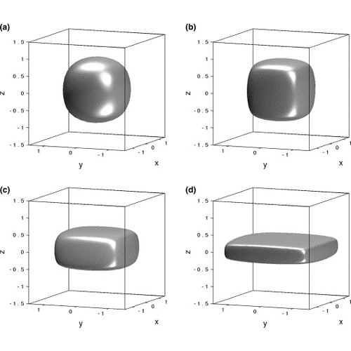The boundary integral method is employed to calculate the equilibrium shapes of precipitates with lattice misfit. Due to the stress engendered by the misfit (lattice parameter difference), the equilibrium shape can range from rounded cuboidal to plate-like to rod-like. The equilibrium shape of precipitate is depends on the ratio between the elastic strain energy and interfacial energy. The picture shows different equilibrium particle shapes with different elastic-interfacial energy ratio, with (a) having the smallest and (d) having the largest.