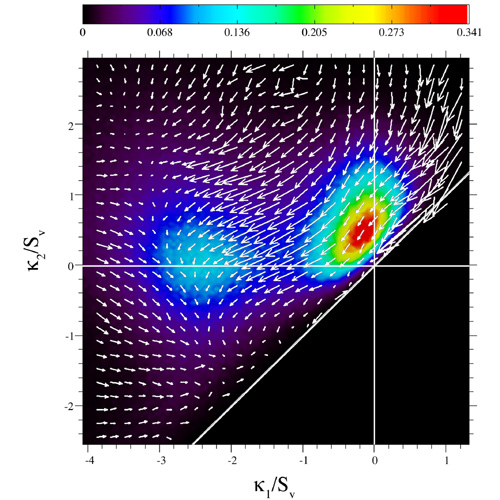 This experimentally measured intensity plot shows the most probable interfacial shapes for a given curvature range found within the 90-minute coarsened sample. The largest peak corresponds to the bends in the liquid walls, while the secondary peak arises from the presence of liquid tubes. The overlaid arrows are predicted flux in curvature space from a phase-field calculation that predicts the evolution of the 10-minute coarsened sample, which point to increasing probability of cylindrical surfaces in agreement with experimental results.