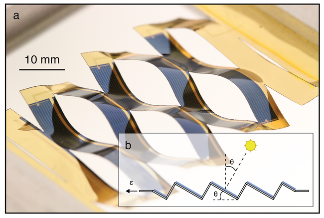 B.S. in Chemical Engineering, Northeastern University My research involves using origami and kirigami design principles to develop novel devices for a wide range of photovoltaic and other optoelectronic applications. Currently, we are investigating the combination of thin film solar cells and tunable kirigami structures as a lightweight, compact, and economical alternative to conventional solar tracking. These devices consist of a simple kirigami cut pattern integrated with thin-film solar cells, whereby pulling on the structure in the axial direction results in a global and predictable change in solar cell angle (Figure 1). By leveraging the unique geometric properties of the kirigami substrate itself, and the excellent electrical and mechanical properties of thin film solar cells, we have demonstrated an efficient and robust tracking method that we hope will significantly broaden the use of solar tracking to new market segments such as mobile and residential (pitched) rooftop tracking ![]() Presentations: