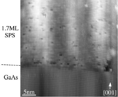 Recently, low-dimensional semiconductor structures have been achieved by alloy decomposition of heteroepitaxial films. For example, in an alloy film AB or a superlattice A/B/A/B, spontaneous lateral phase separation often leads to the formation of lateral superlattices consisting of alternating A-rich and B-rich layers. The relative roles of morphological undulations and random compositional non-uniformities in the initiation of alloy phase separation are the subject of continued debate. In heteroepitaxial semiconductor alloy films, we suggest that phase separation is a misfit-driven kinetic process, initiated by random compositional variations which later develop into coupled compositional variations and morphological undulations. In short-period superlattice (SPS) structures, we report the first direct observation that phase separation is initiated in the first atomic layer in contact with a buffer. We also report the first direct evidence for anti-site vacancy diffusion, originally predicted by Van Vechten nearly 30 years ago. These mechanisms are likely to be applicable to a wide range of lattice-mismatched thin film systems. The figure shows XSTM image of 1.7 ML InP/GaP vertical SPS, with lateral contrast modulations, presumably due to alloy phase separation.