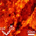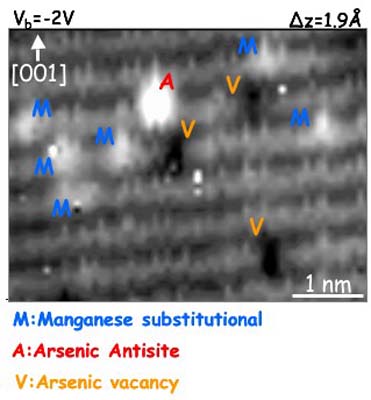 For many compound semiconductors, the introduction of impurities at dilute concentrations leads to dramatic changes in the electronic, optical, and magnetic properties. For example, the incorporation of a few percent manganese into GaAs enables a combination of semiconducting and ferromagnetic behavior. The resulting dilute magnetic semiconductors are promising for several applications including spin-electronics and spin-optoelectronics. In both cases, the nanometer-scale details of impurity incorporation are critical to understanding and controlling the observed properties. Thus, we are exploring the details of the incorporation of Mn into GaAs films and InAs QDs, using cross-sectional scanning tunneling microscopy (XSTM), in conjunction with scanning tunneling spectroscopy (STS). In GaMnAs alloys, we have identified several point defects, including substitutional Mn, arsenic antisites, and arsenic vacancies, as shown in the figure. Our quantitative studies of the concentrations of these defects as a function of Mn composition suggest that As antisite and vacancy defects contribute to free carrier compensation in this system. In addition, our pair correlation analyses suggest that Mn is mainly randomly distributed in GaMnAs, for a variety of compositions. We are currently endeavoring to quantify the effects of the point defects and clusters on the ferromagnetic properties of GaMnAs and related alloys.